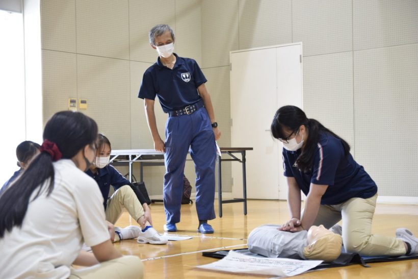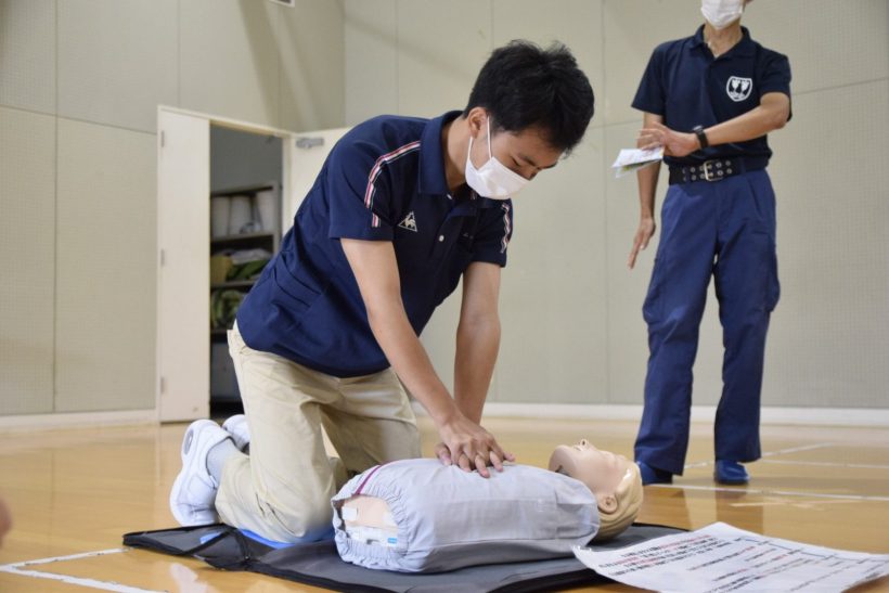 二人一組、またはグループで協力しながら、傷病者の発見から通報、心肺蘇生、AEDの使用、そして救急隊への引き継ぎまでの一連の流れをロールプレイング形式で確認。チームで動くことの重要性、周囲との声かけの必要性を肌で感じることができました。