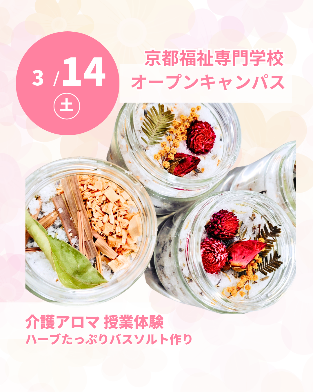 内容: 介護アロマ 授業体験(ハーブたっぷりバスソルト作り)