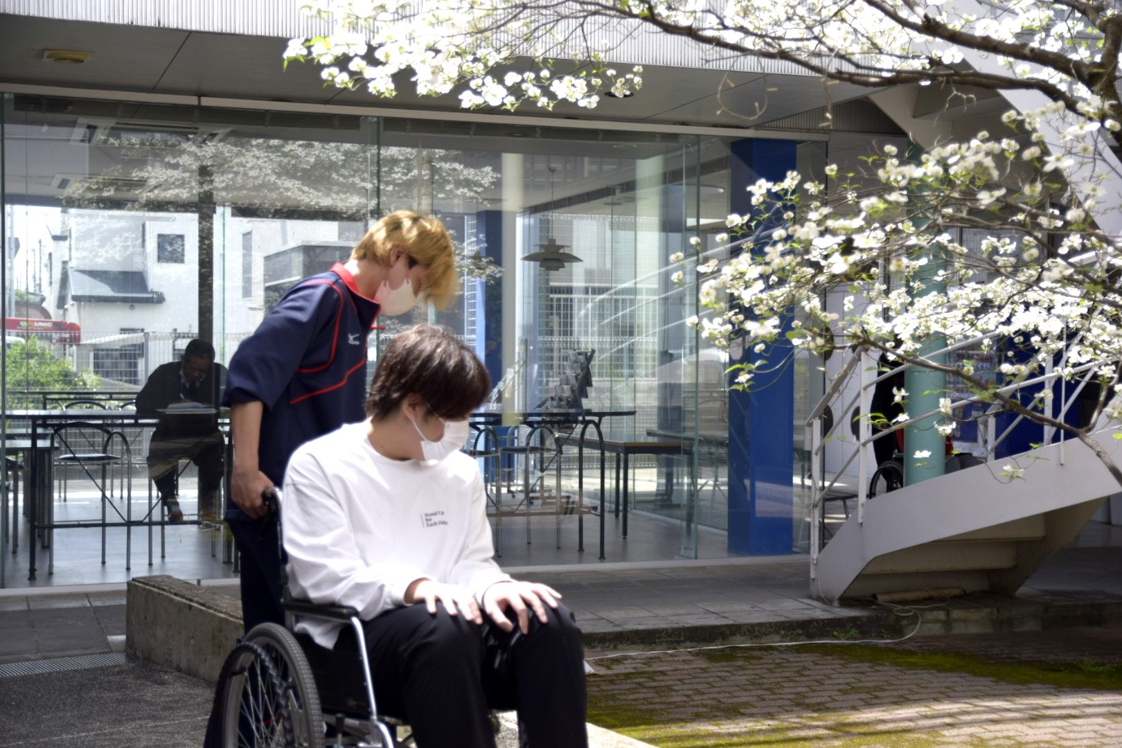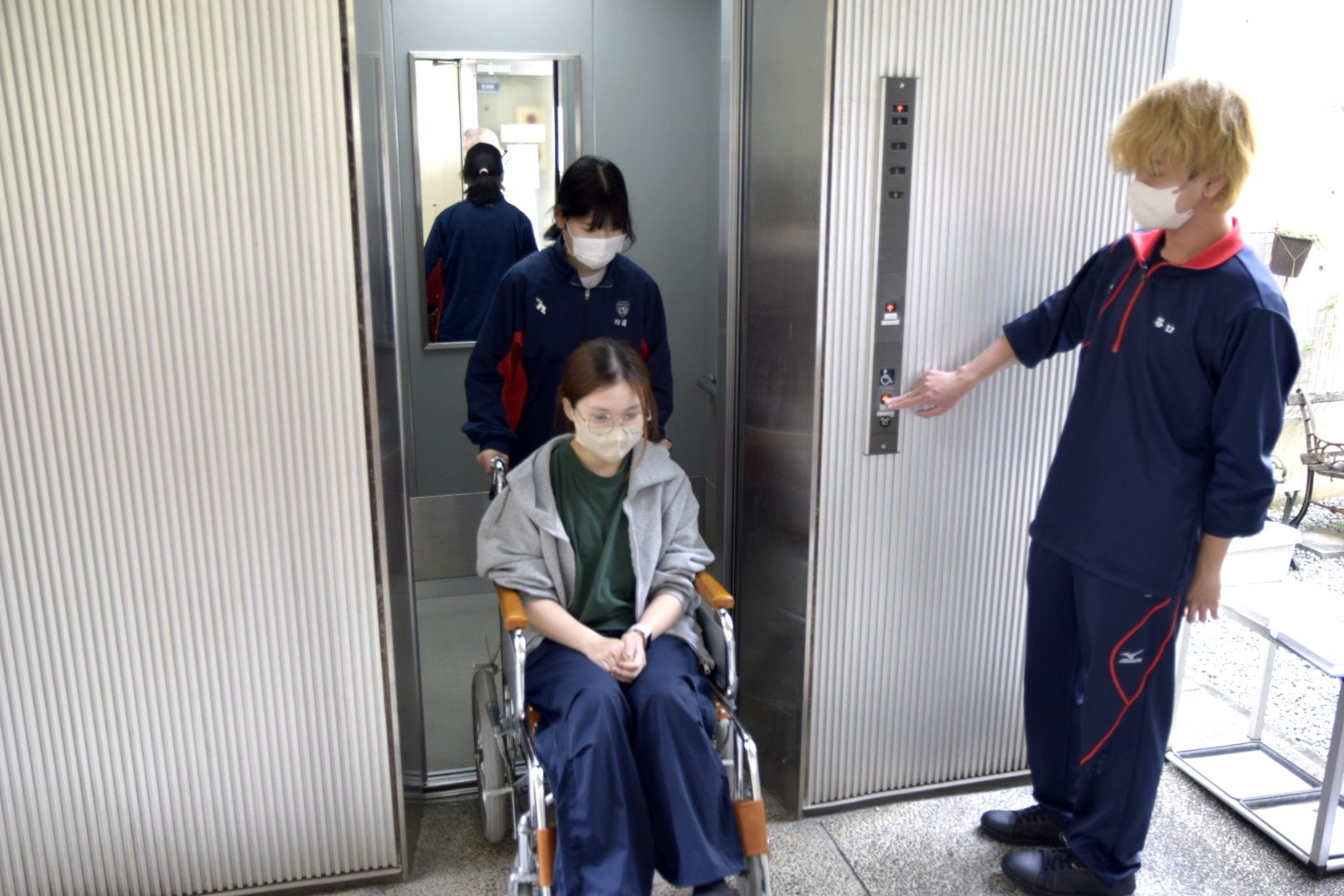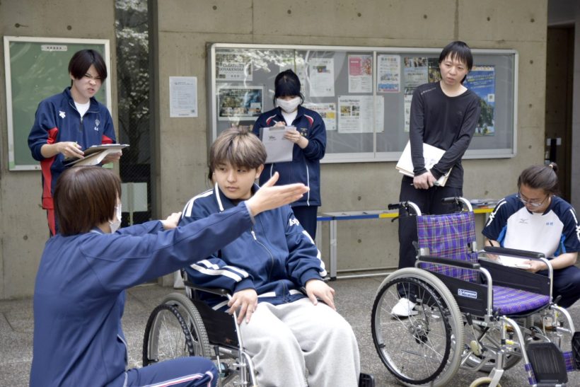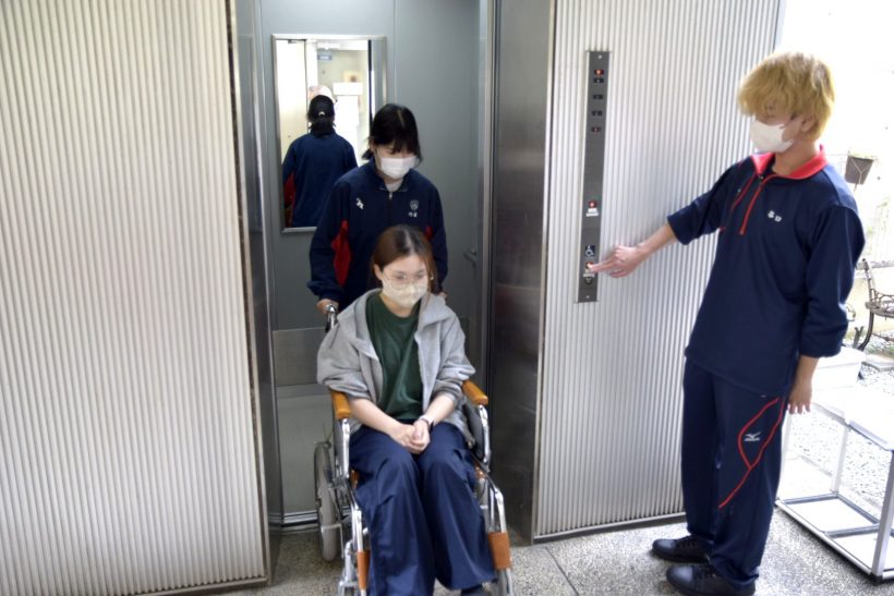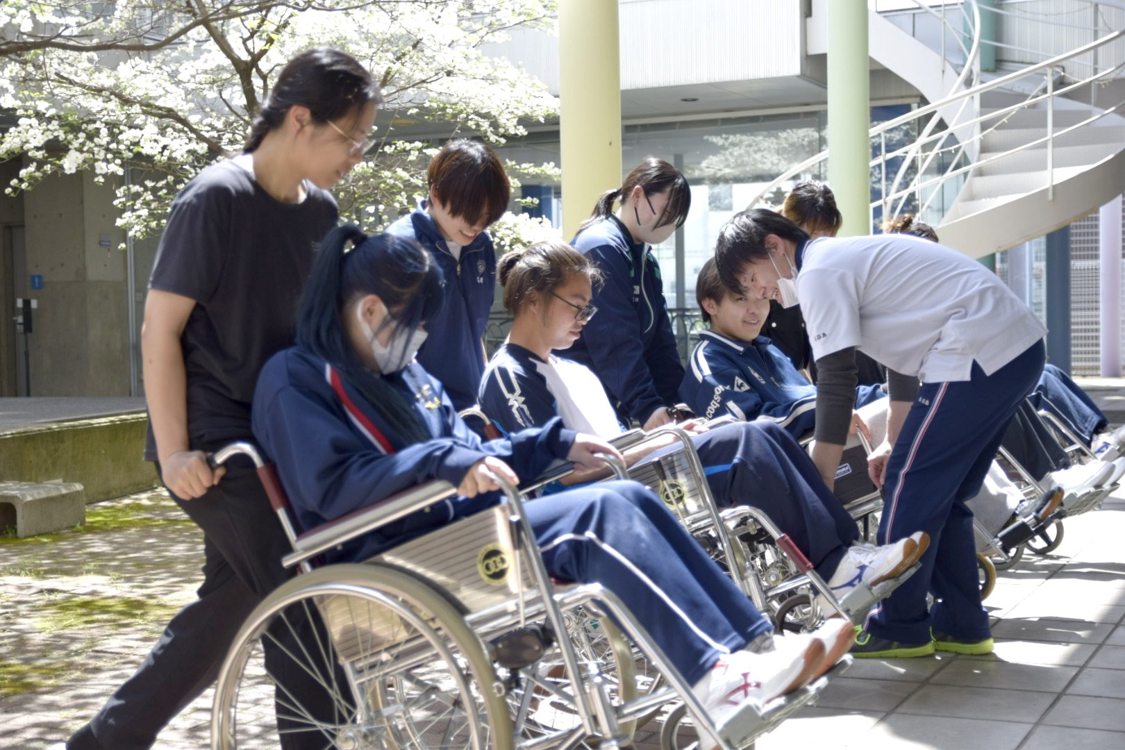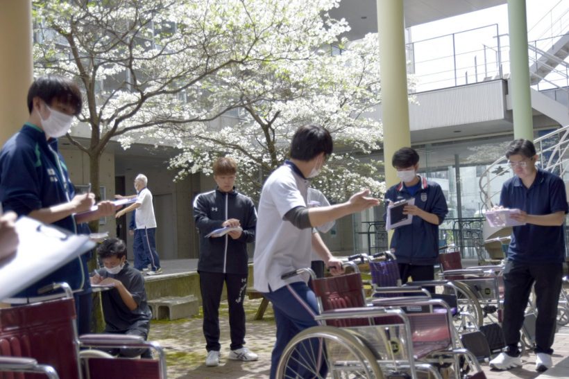 春の温かな日差しの中、1年生による生活支援技術の授業で、「車椅子実習」が行われました。