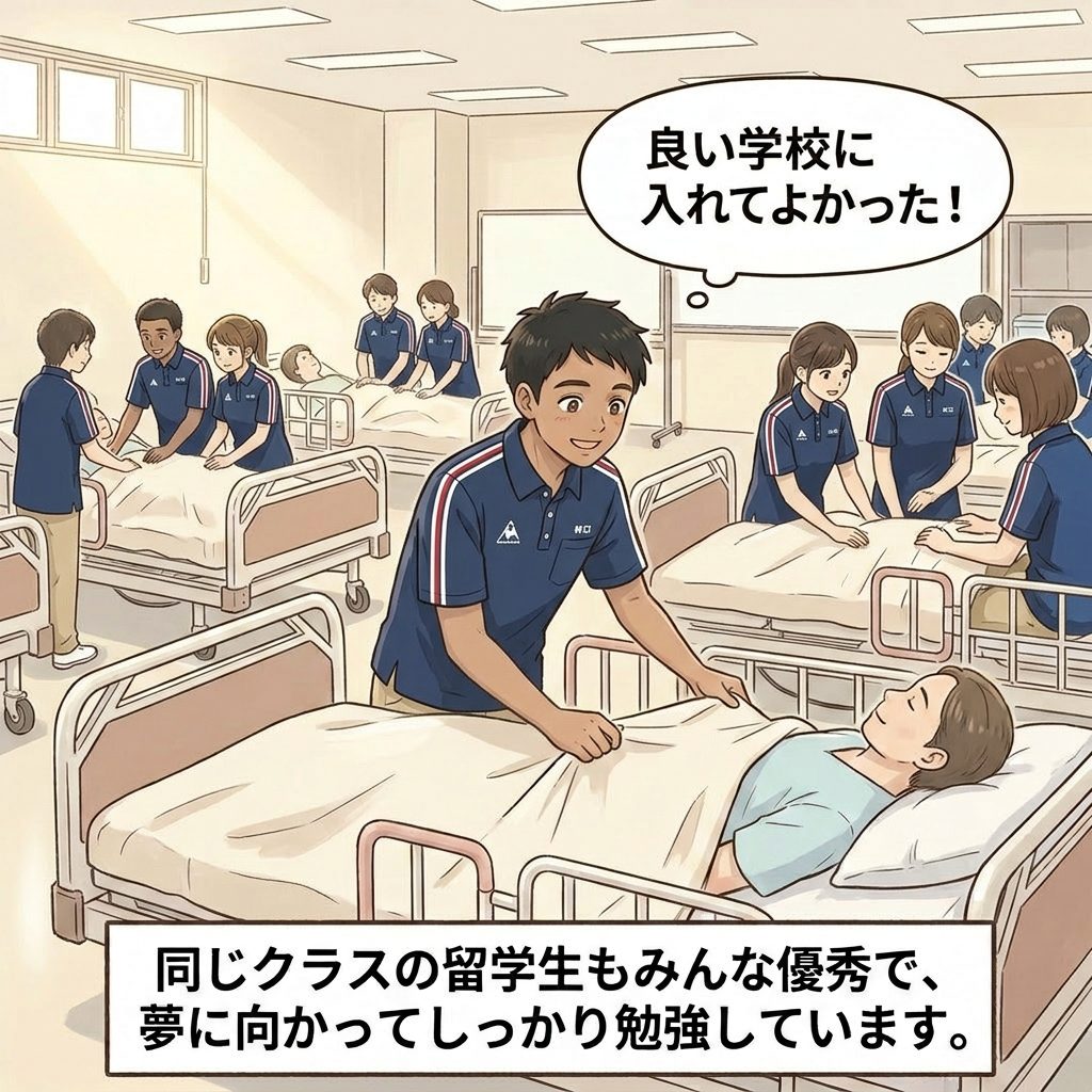 しかしこの主人公のような日本語能力が高く、真剣に介護を学びたいと願う留学生にとっては、意外にも留学生の少ない学校を探しているという声を多く聞きます。