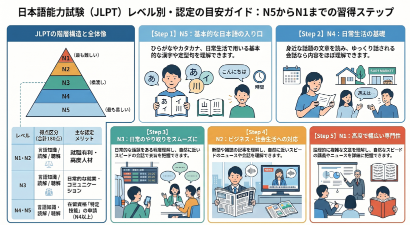 留学や就職などで日本語能力の目安として採用されているJLPT(日本語能力試験)において、N2とは自然に近いスピードのニュースや会話を日本語で理解でき、読み書きにおいても日本人に近い能力を身につけていることを証明しています。