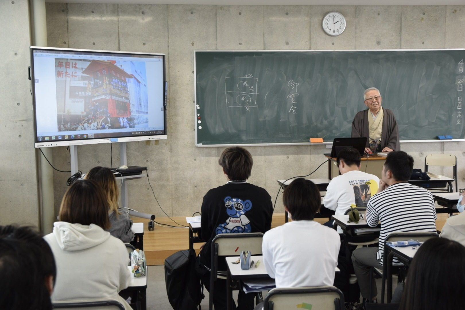 先週に行われた授業では、京都の三代祭の一つ「祇園祭」について、特別講師に公益財団法人祇園祭山鉾連合会の木村幾次郎 理事長をお迎えし、祭の歴史や様々な装飾品などについてのお話を伺いました。