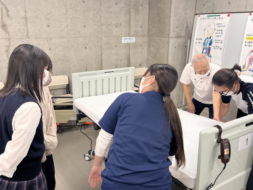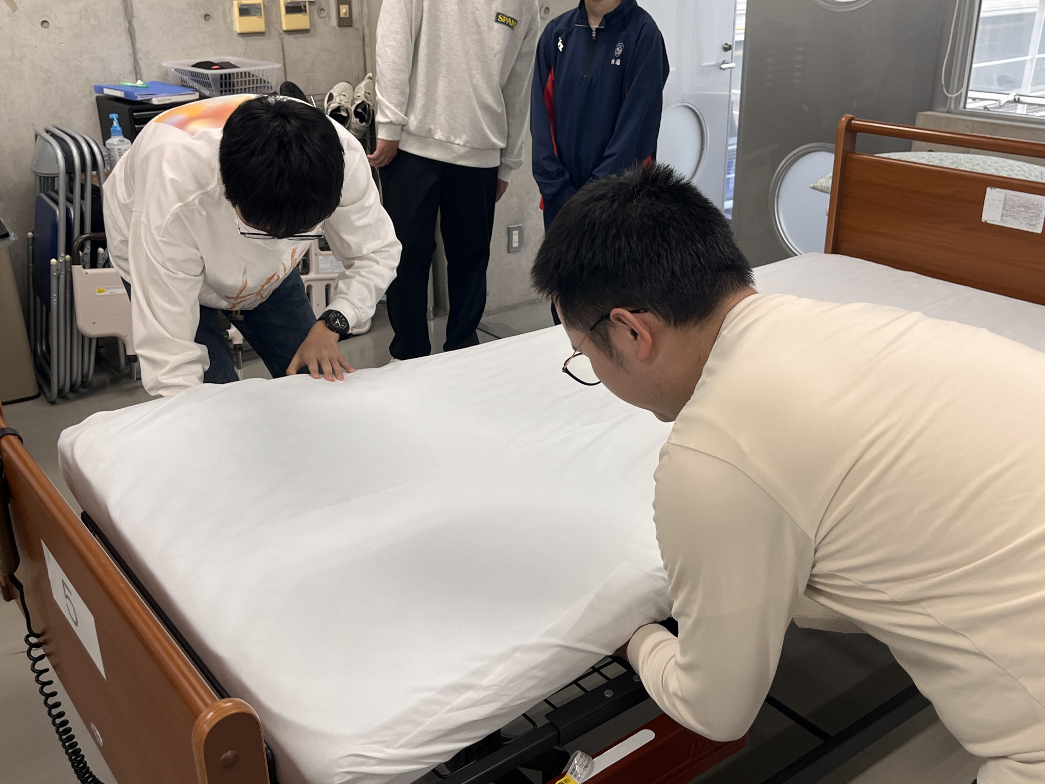 学生たちの真剣な学びの様子を見学した後は、2年生の学生スタッフと一緒にベッドメイクを体験しました。