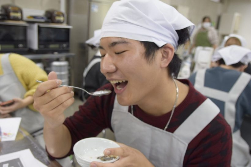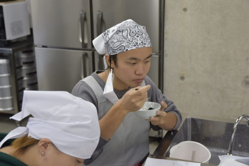 調理のあとは、実際に自分たちが作った介護食を試食します。そこで学生たちが感じたのは、プロの調理技術の難しさと、介護食の奥深さでした。