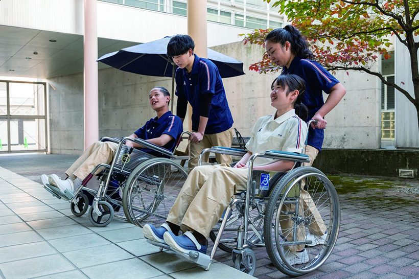 広々とした中庭は、安全な環境で車椅子の移動介助などを徹底的に練習する絶好の場所です。また、多目的に利用される講堂では、レクリエーションの企画・実施をのびのびと実践し、多様な場面で活躍できるスキルを身につけます。